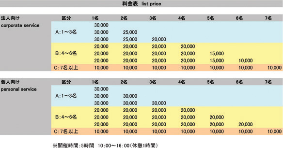 価格(講習料・出張料・他)は予告無く変更する場合があります。 | ||||||